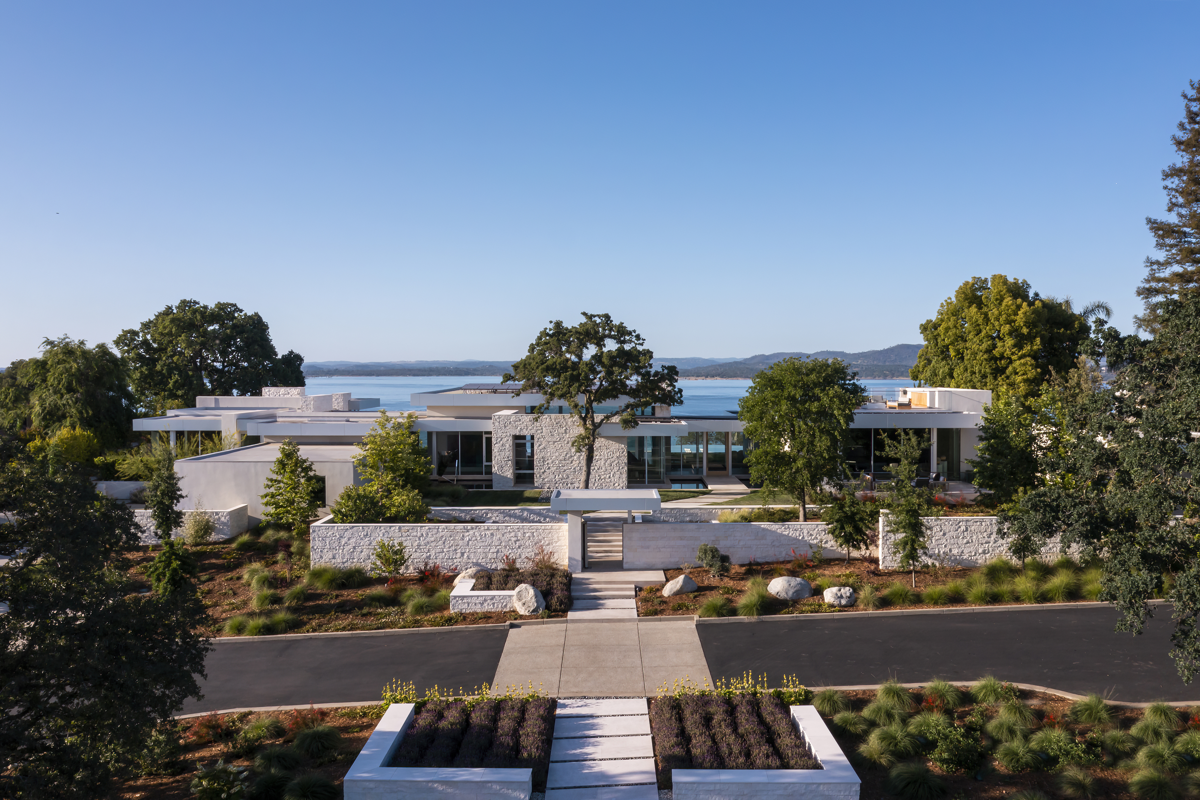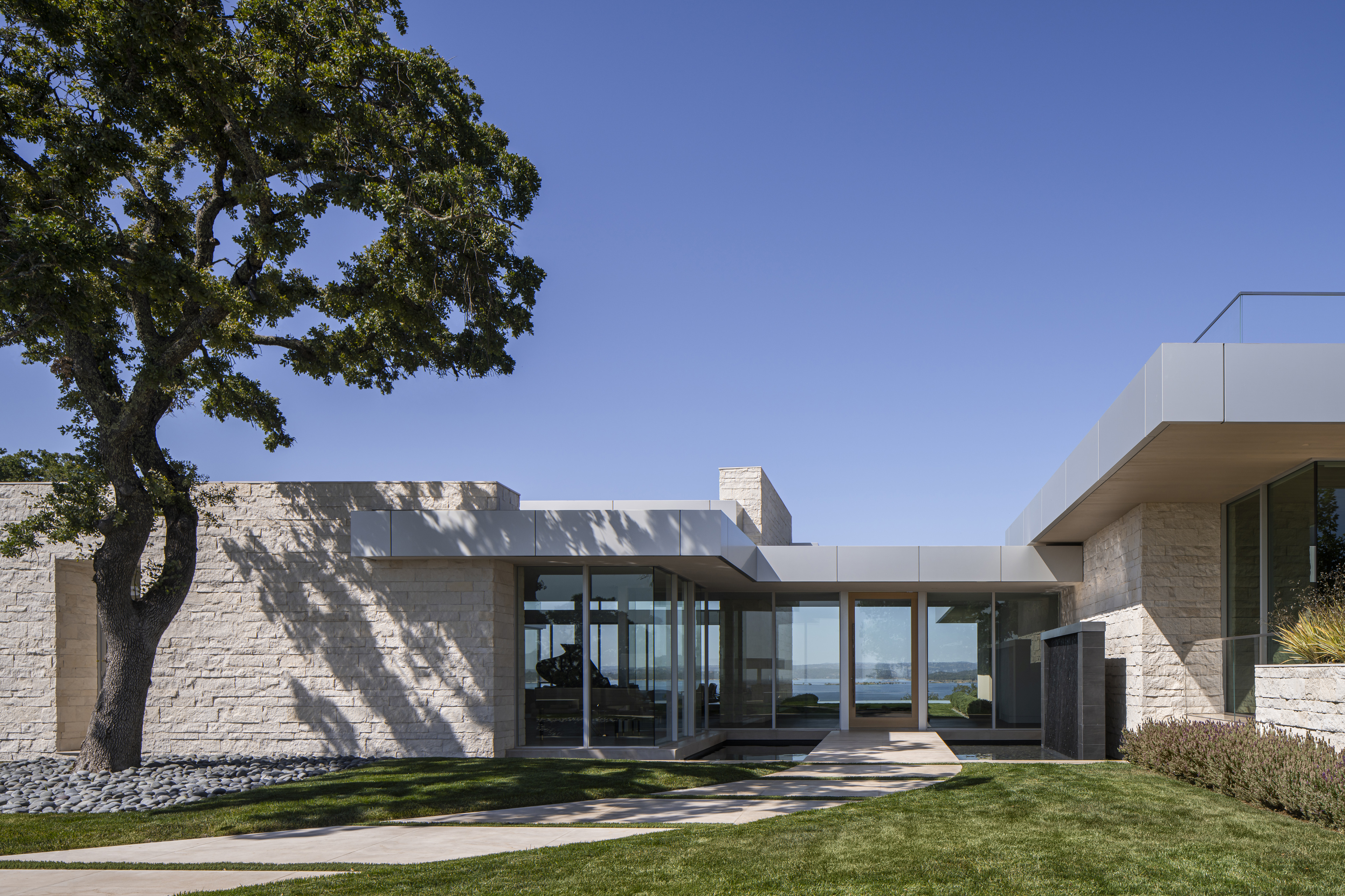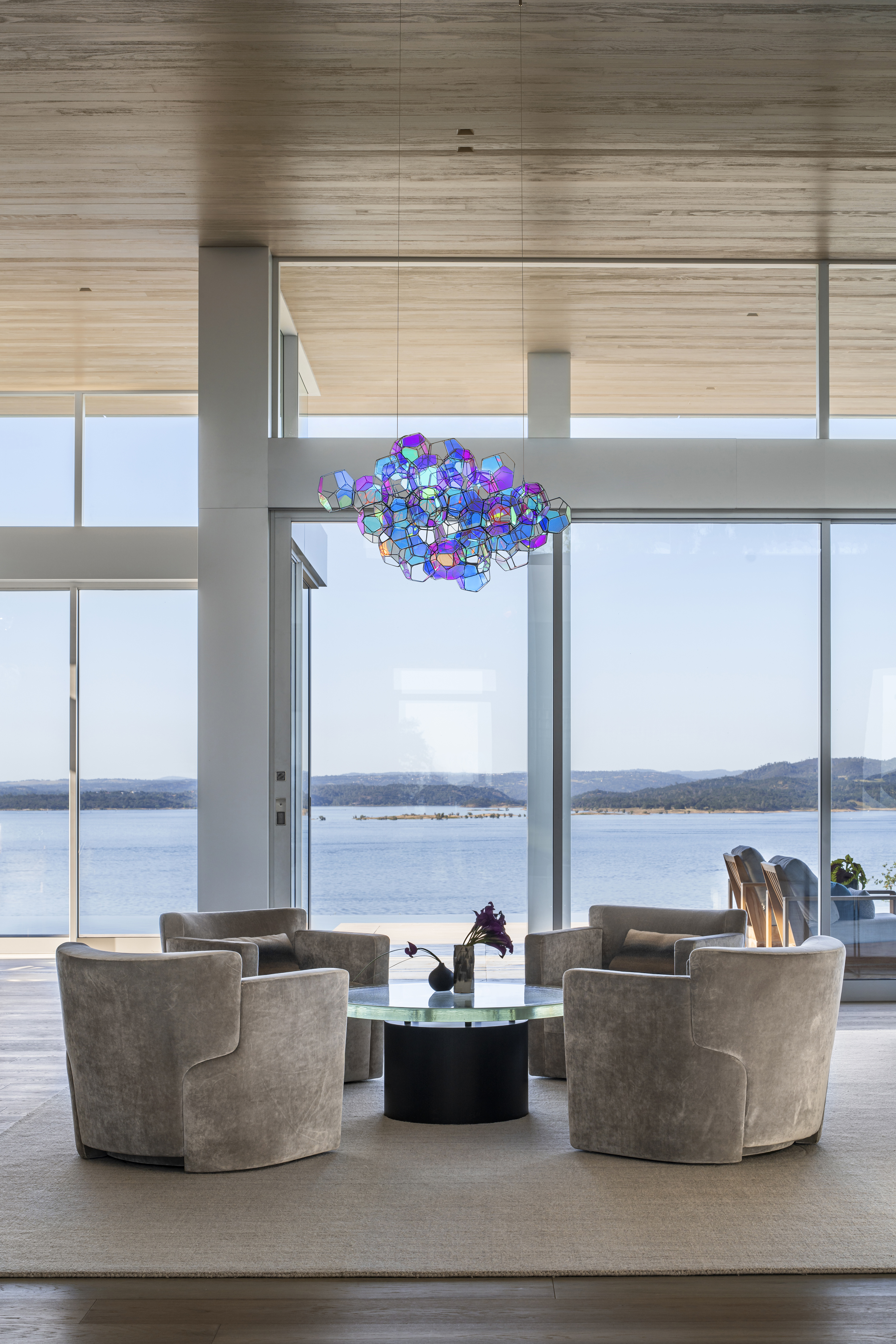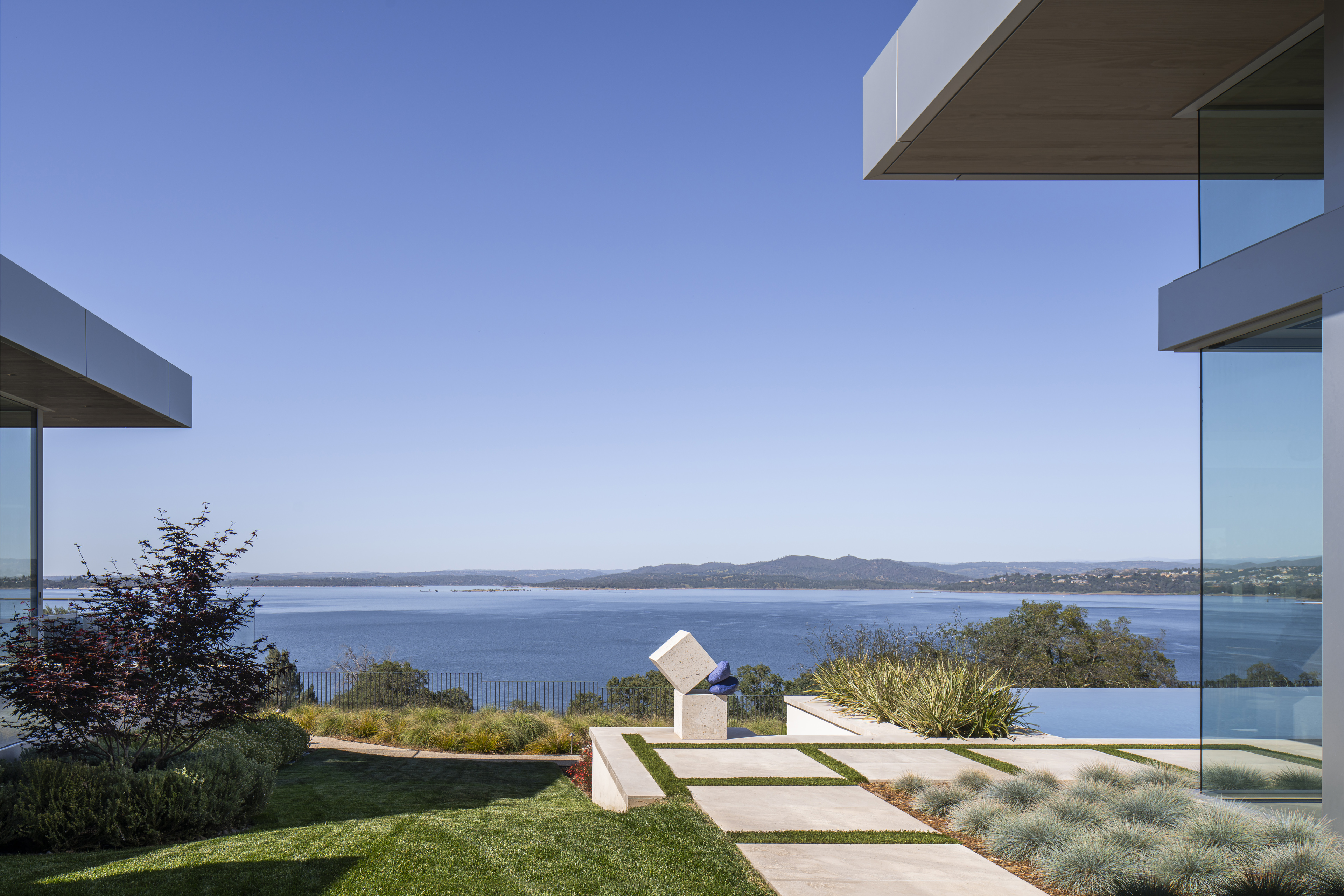 Inspired by its natural surroundings, the interiors and architecture of this residence reflect the site of Lake Folsom, literally and figuratively. Strict, modernist planes and surfaces are softened with texture and tonality, giving deference to the lake, its shoreline and the mountains beyond. Envisioned as a family home, comfort blends seamlessly with refined design and thought-provoking art.