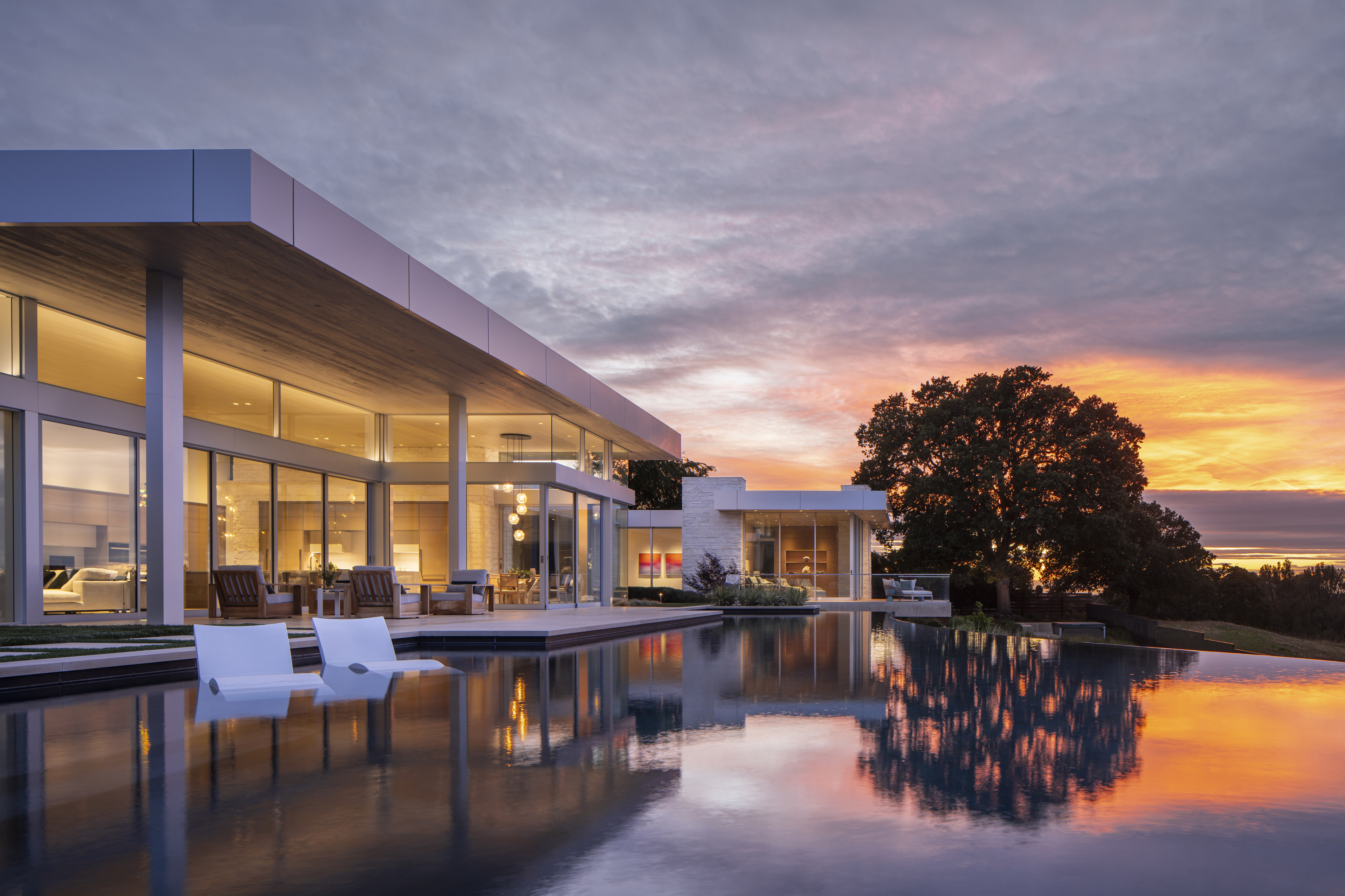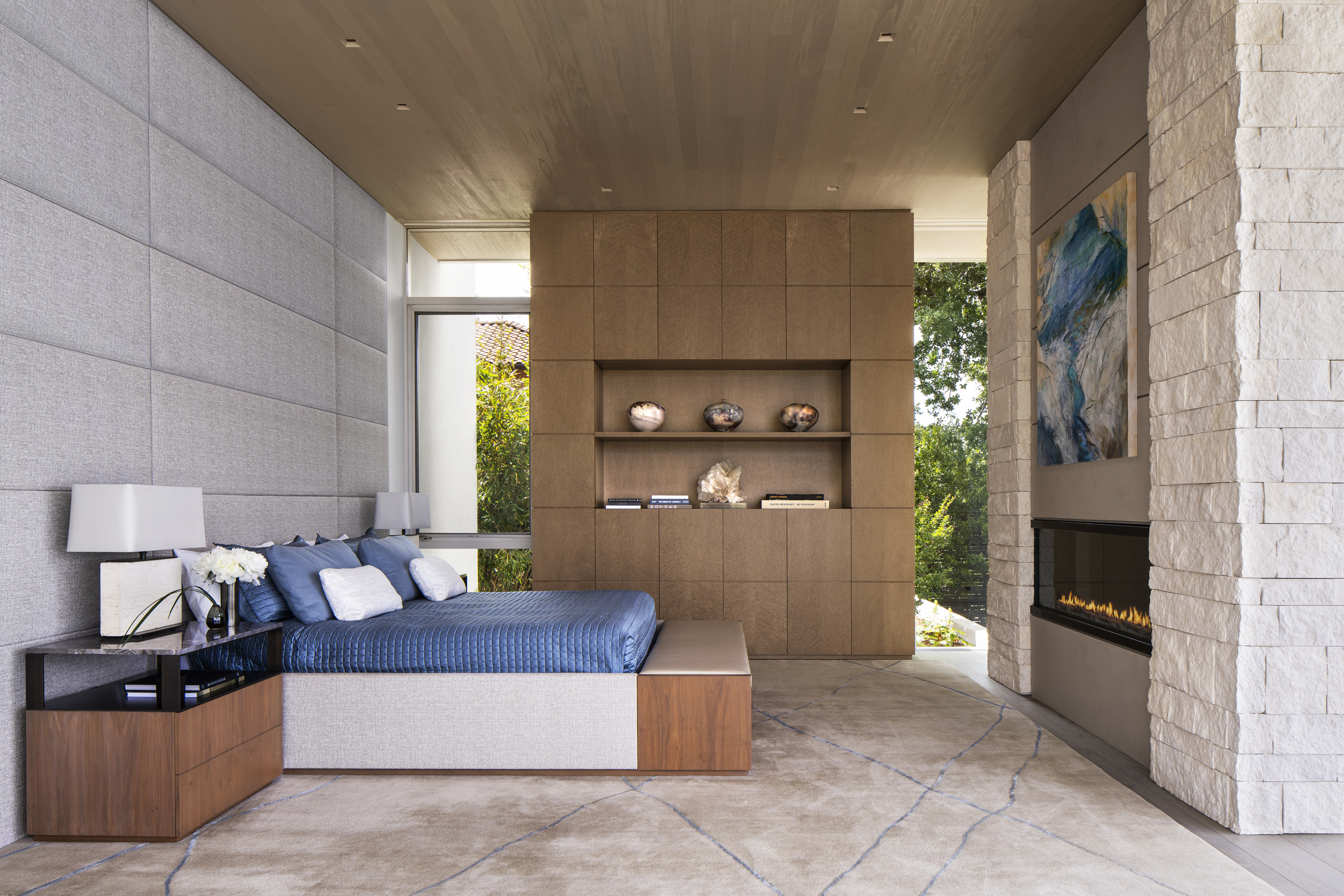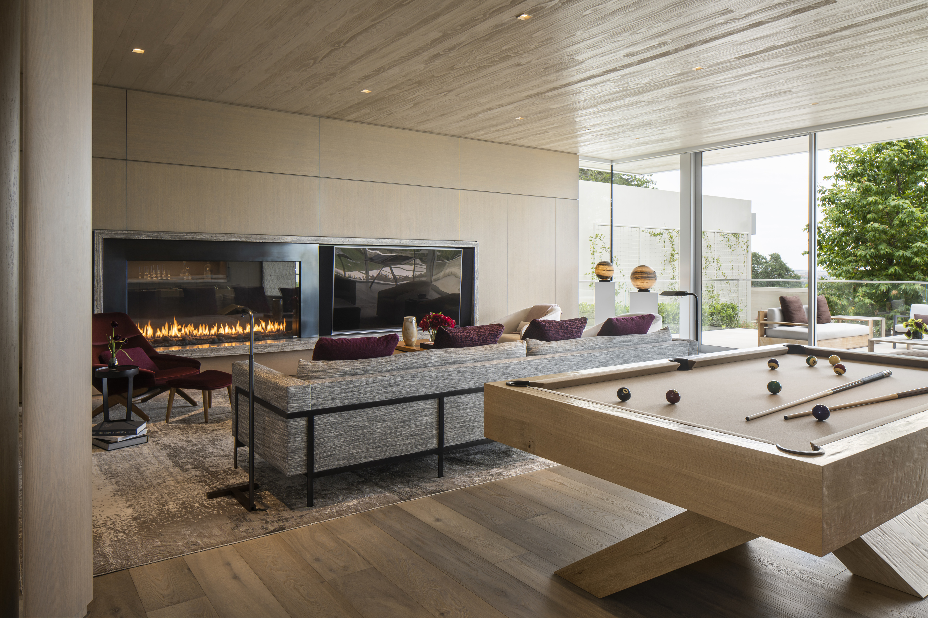 Anchoring the home, the great room is executed in natural split face limestone, natural oak wood and a patinated steel fireplace focal wall.