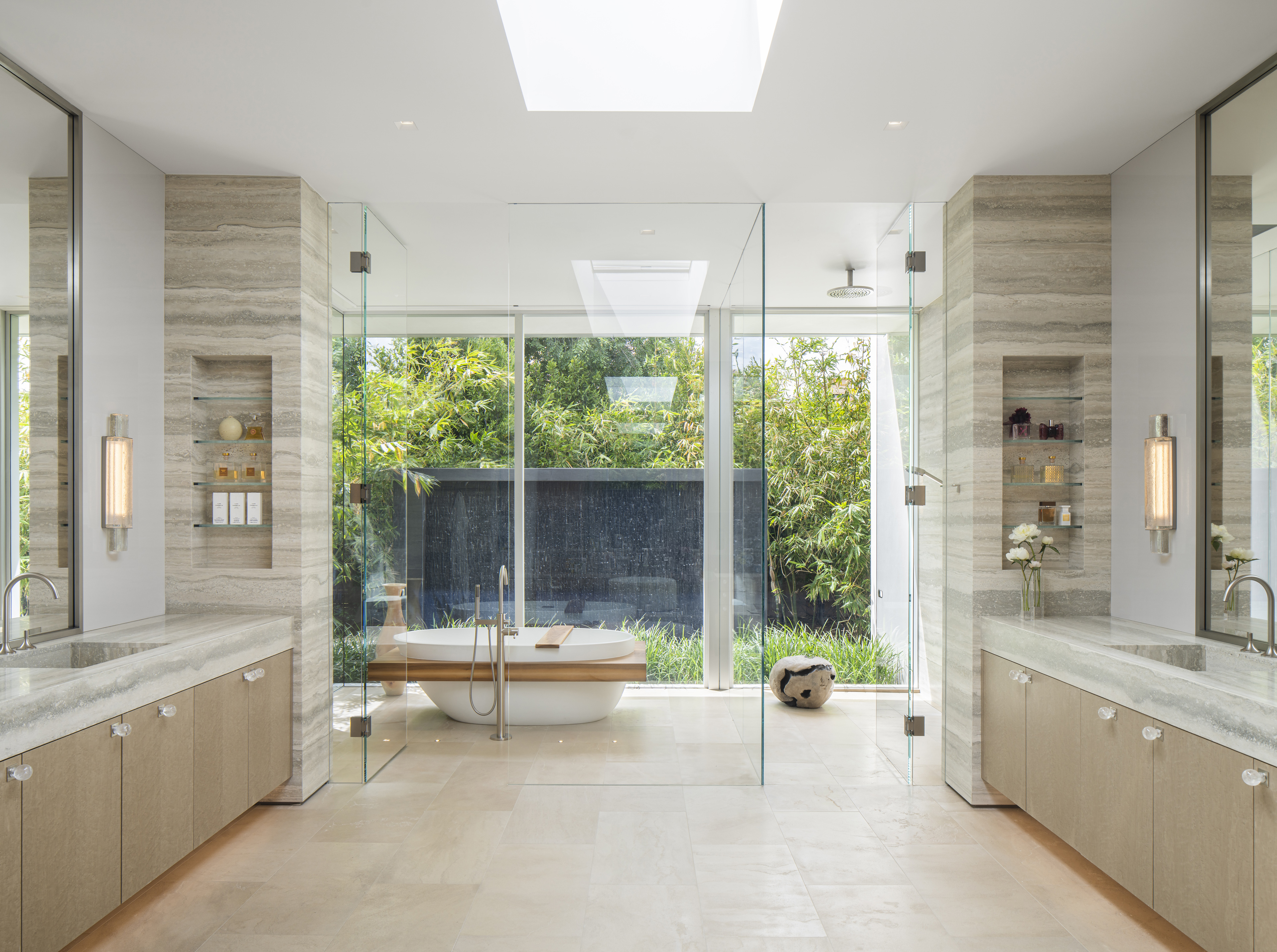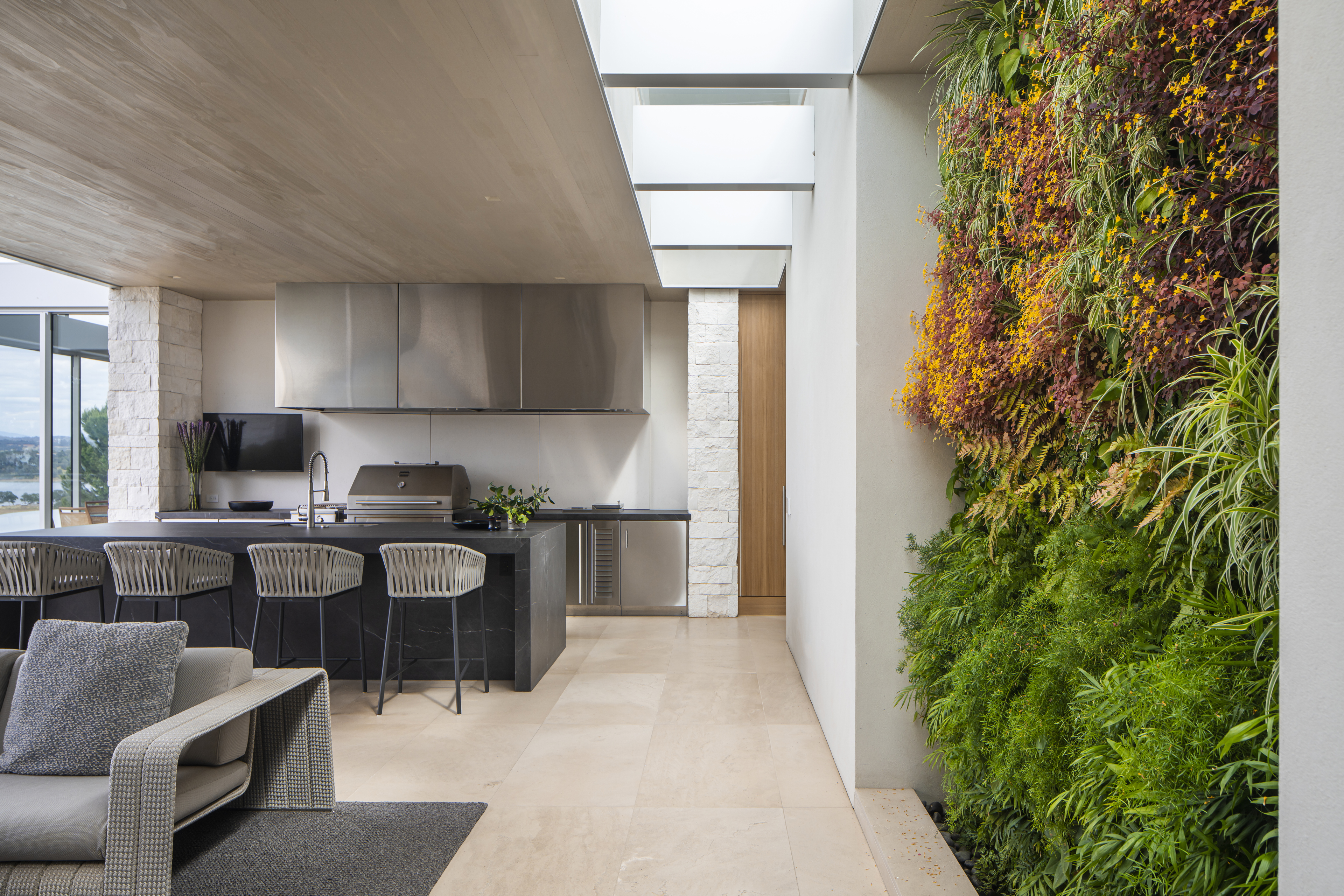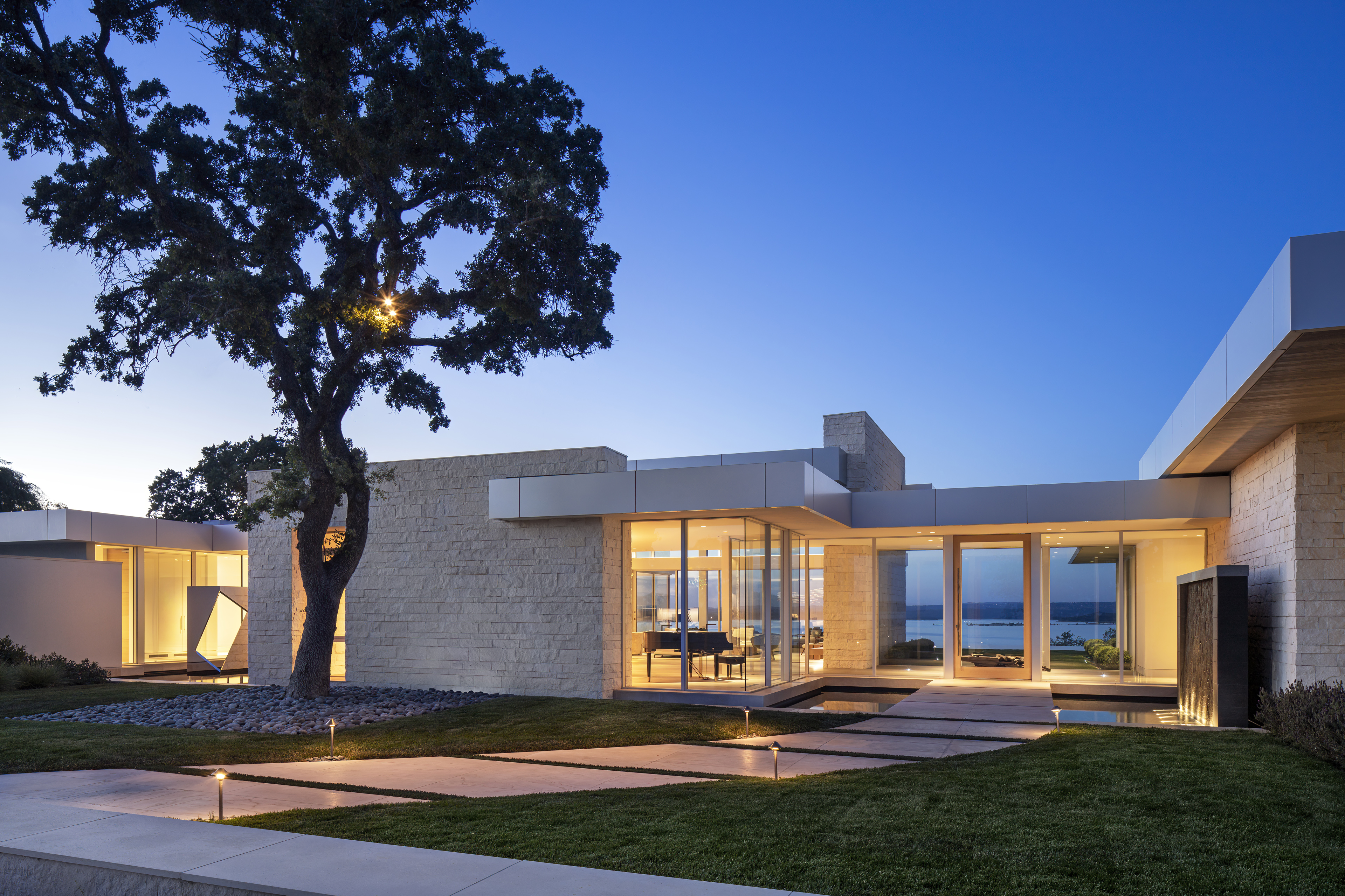 Anchoring the home, the great room is executed in natural split face limestone, natural oak wood and a patinated steel fireplace focal wall.