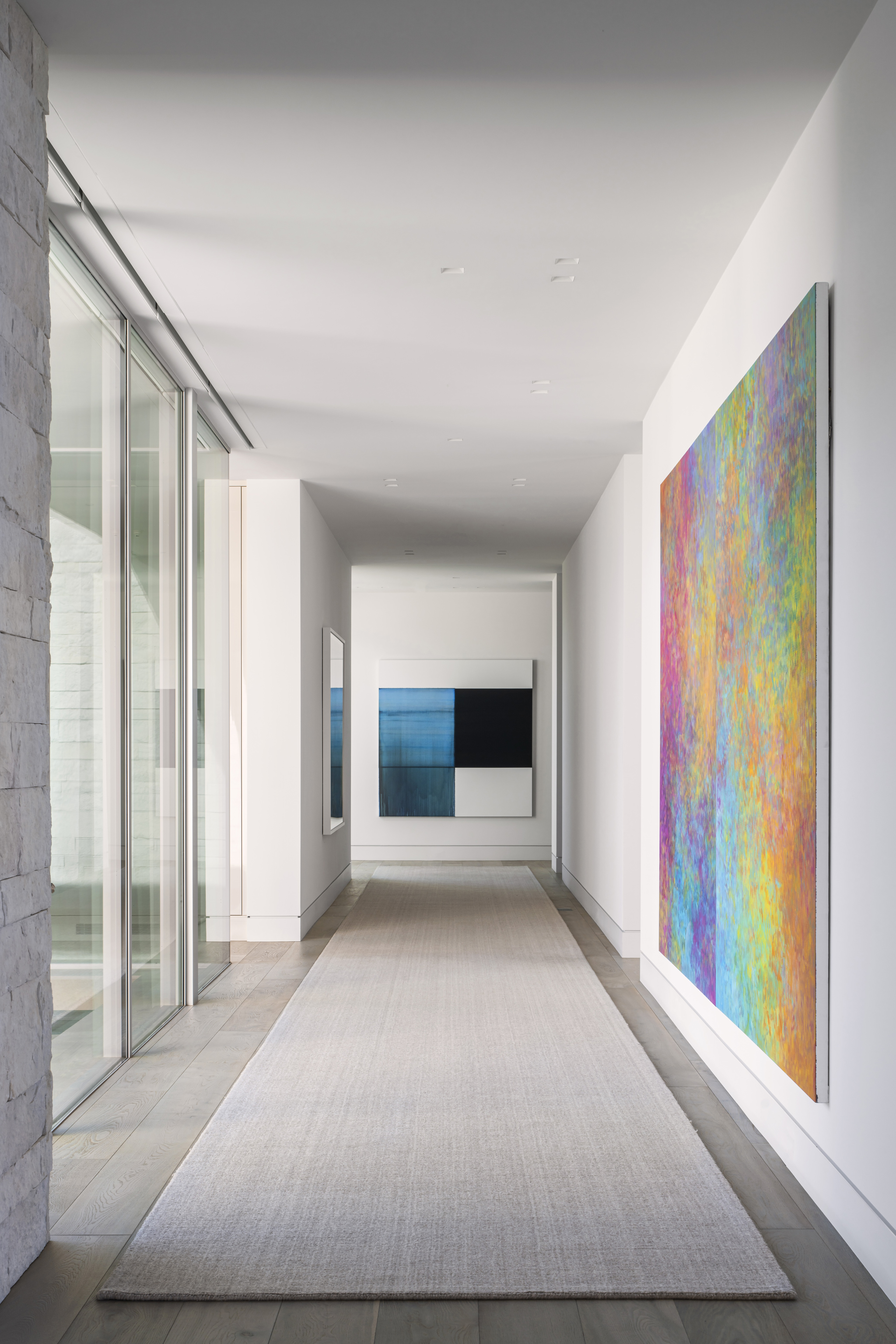 Louvered screens, used to create mystery between spaces in this open plan home, lend texture to the spacious gallery for the collection of art.