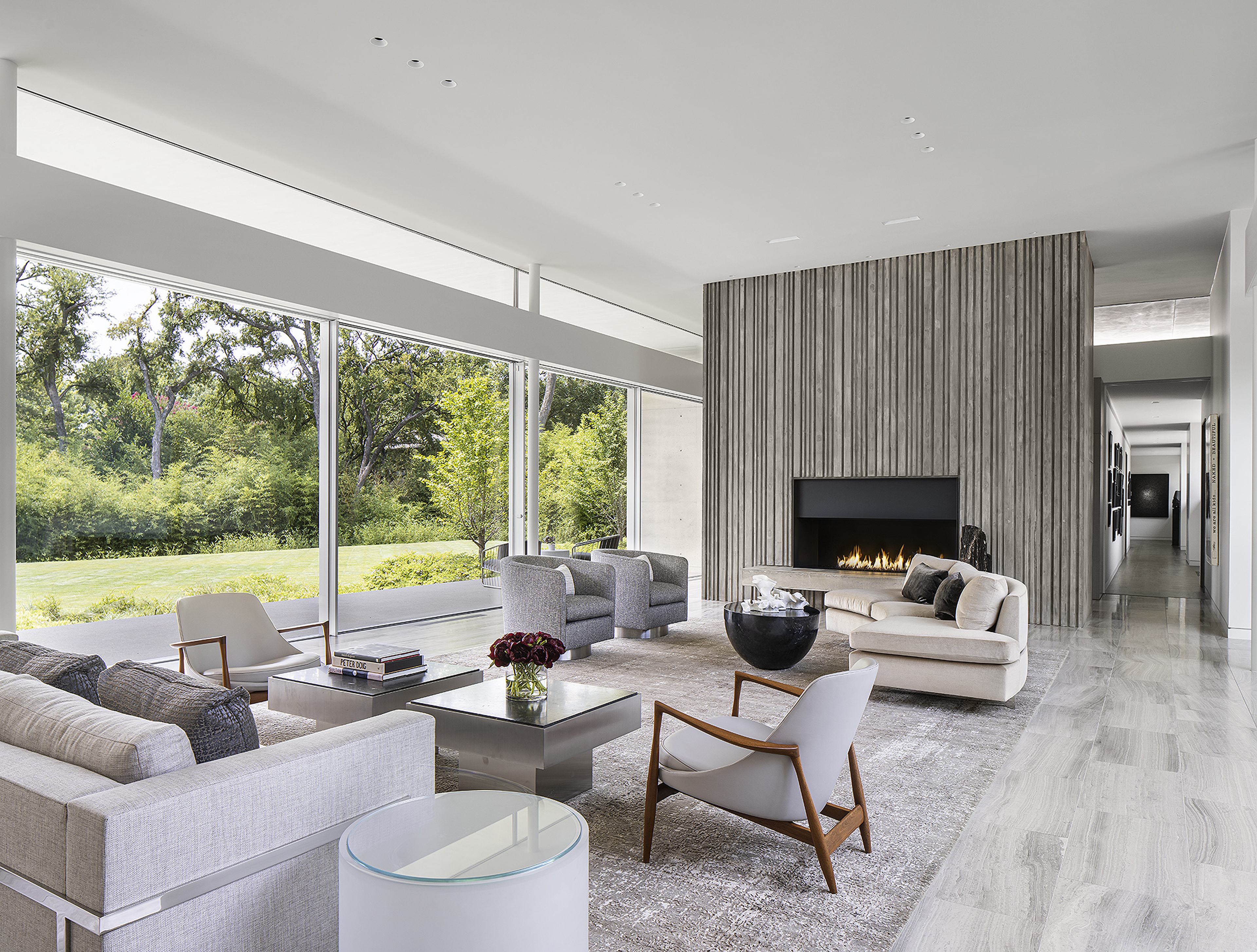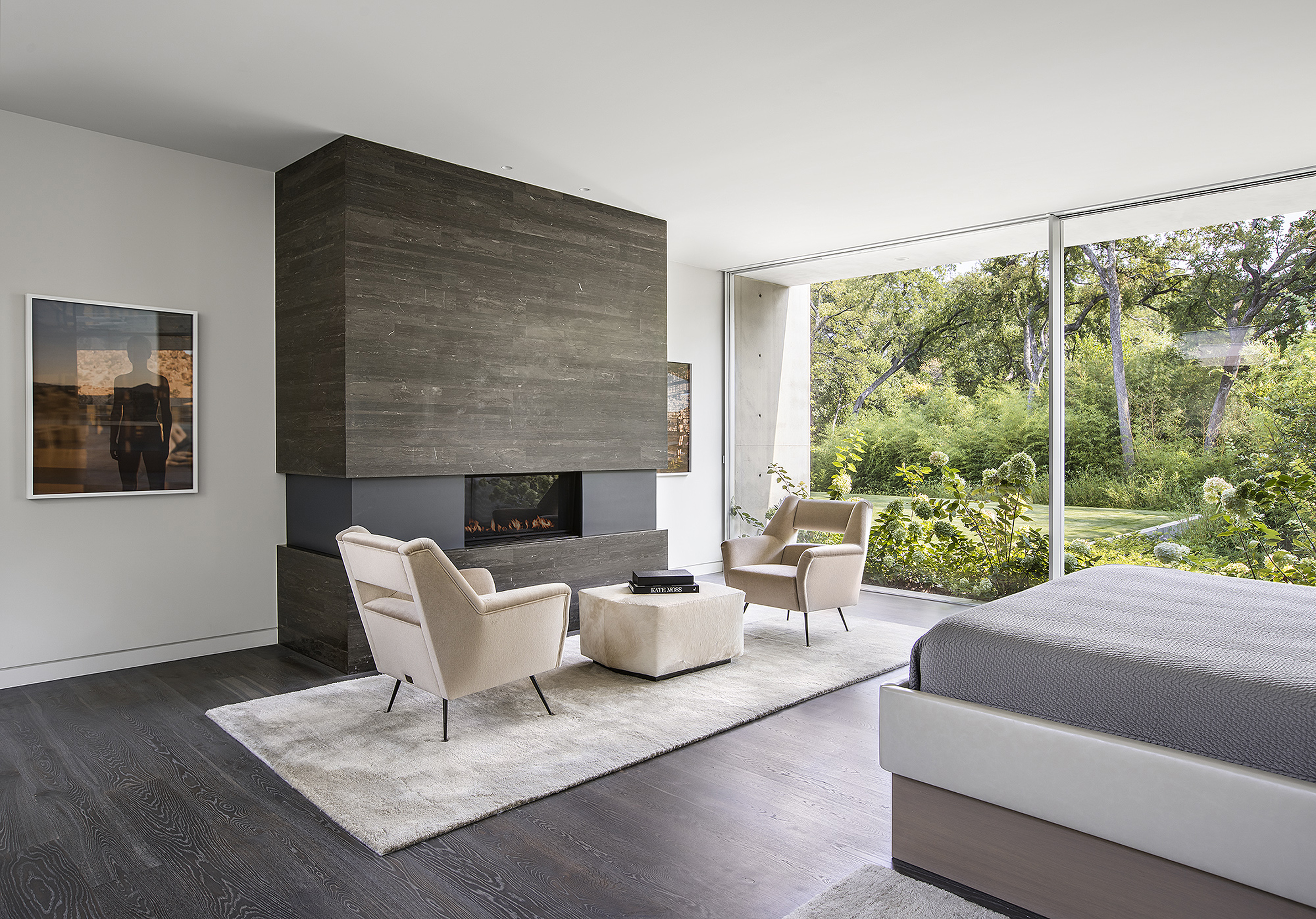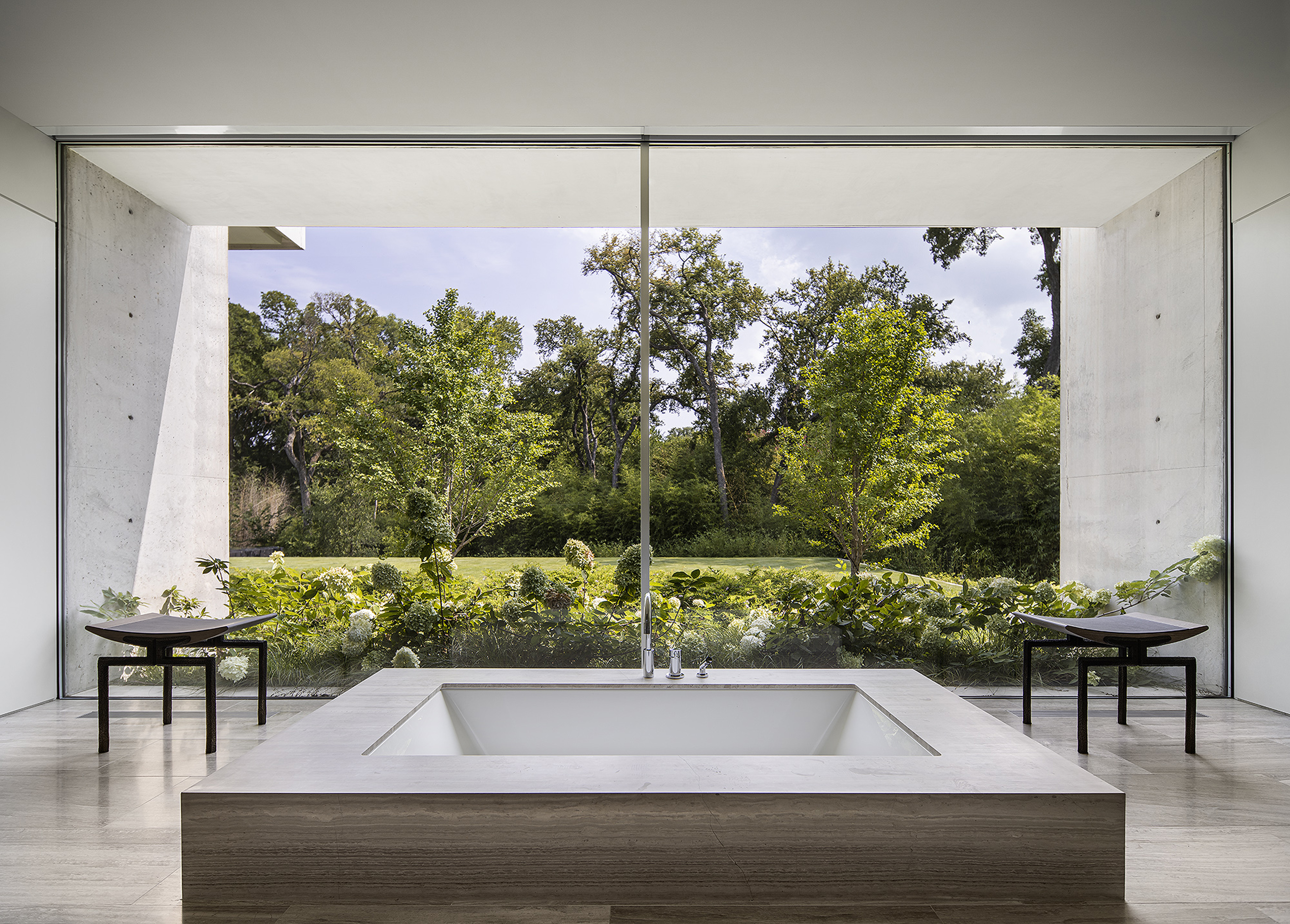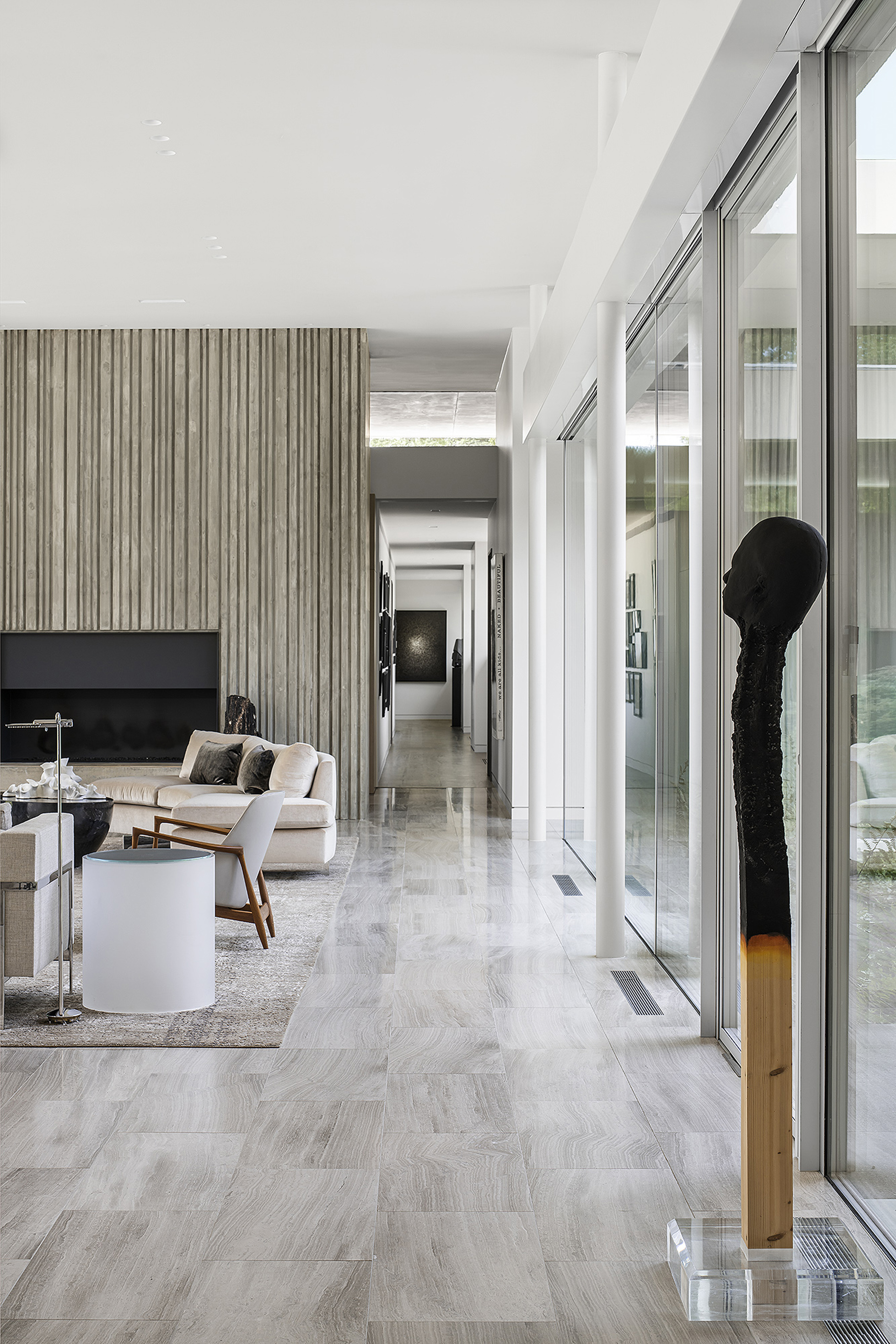 Interiors are carefully curated to provide their own strength within the rigorous architecture. Influences from the International Style, including Milo Baughman and Ib Kofod-Larsen, are anchored by a solid black granite Magni Home Collection table.