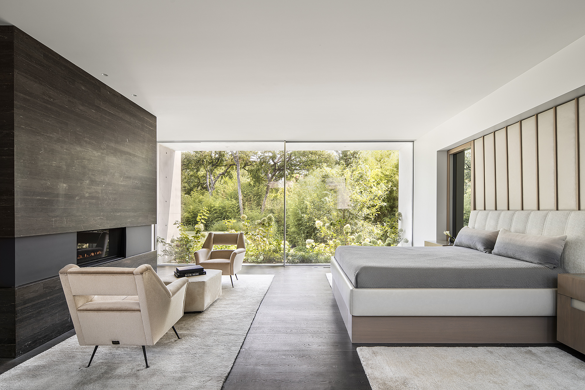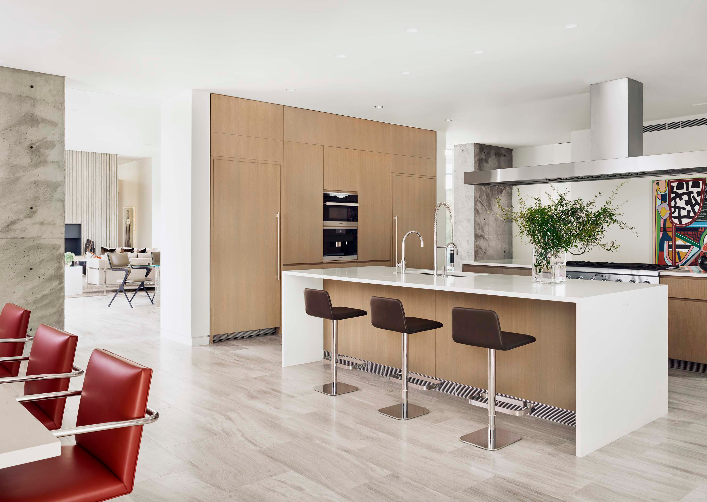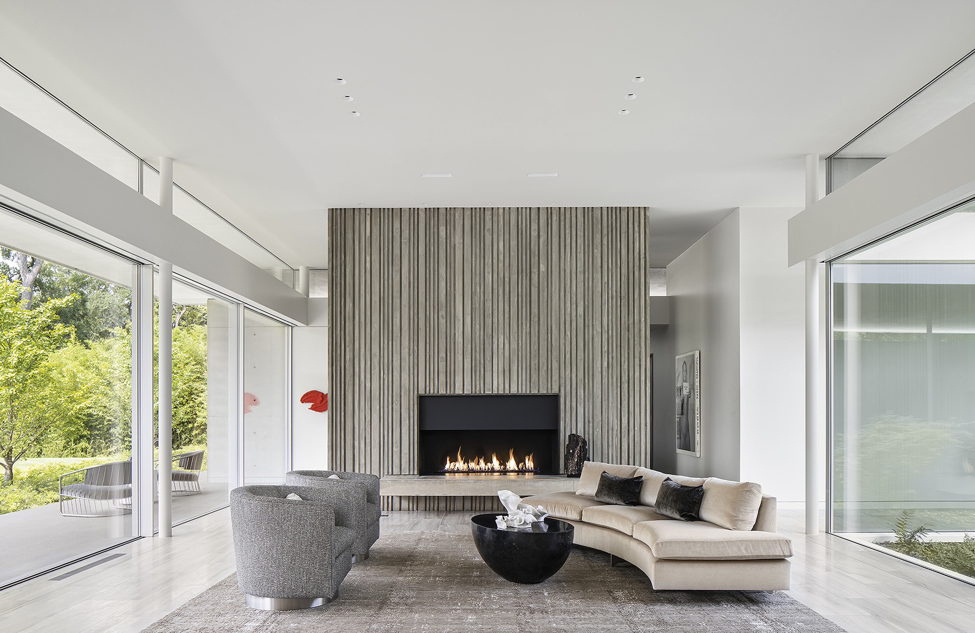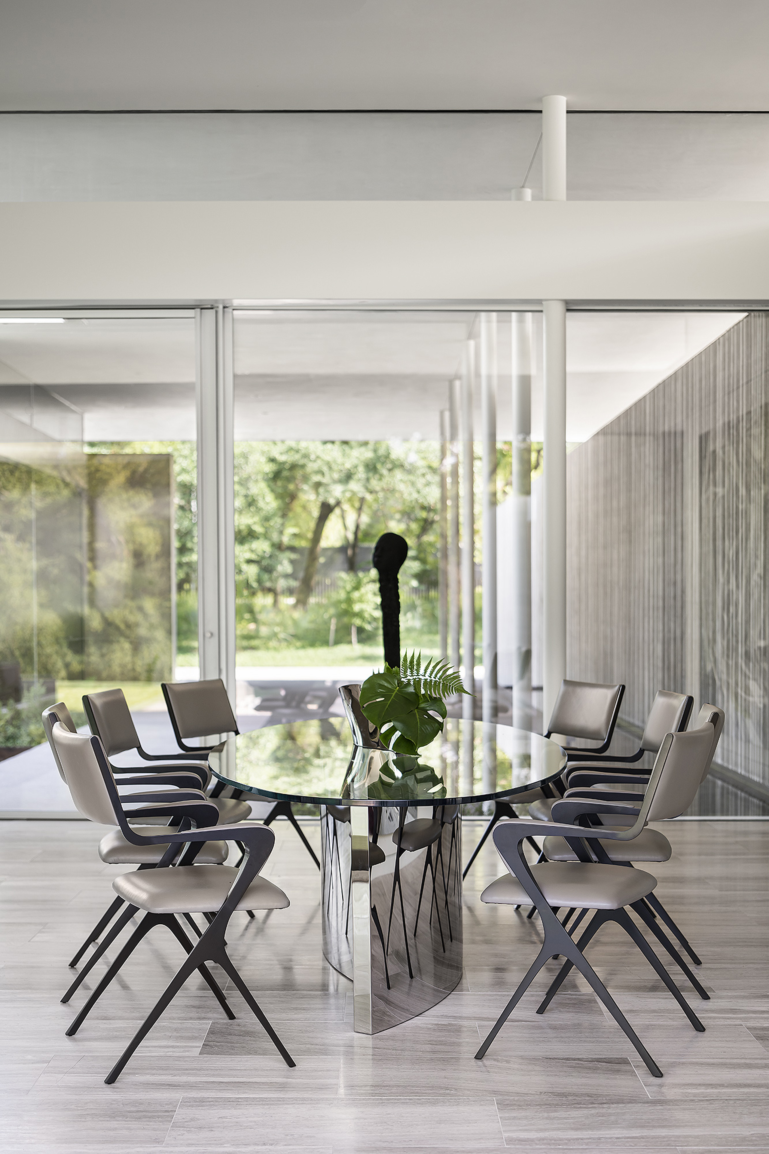 Interiors are carefully curated to provide their own strength within the rigorous architecture. Influences from the International Style, including Milo Baughman and Ib Kofod-Larsen, are anchored by a solid black granite Magni Home Collection table.