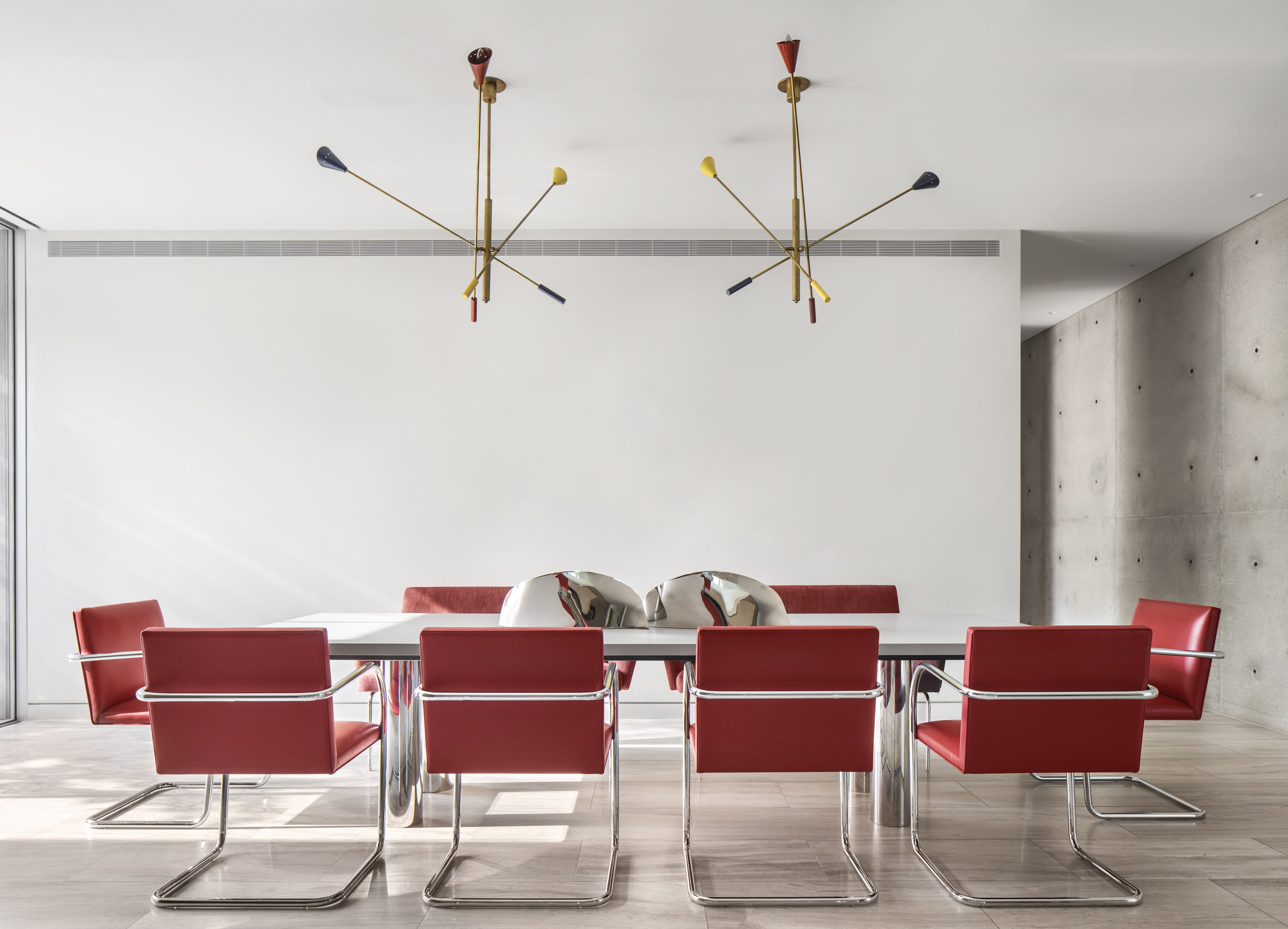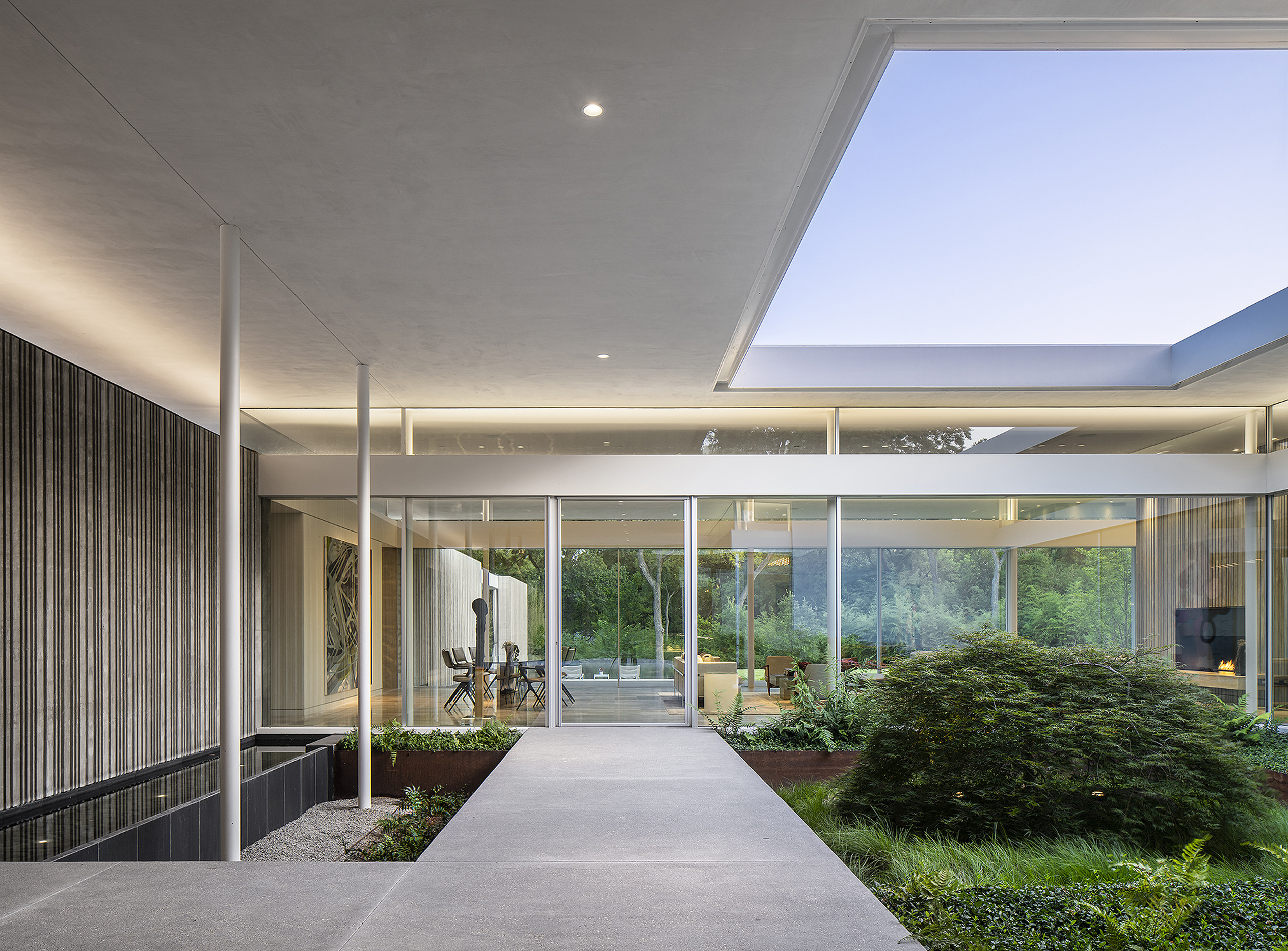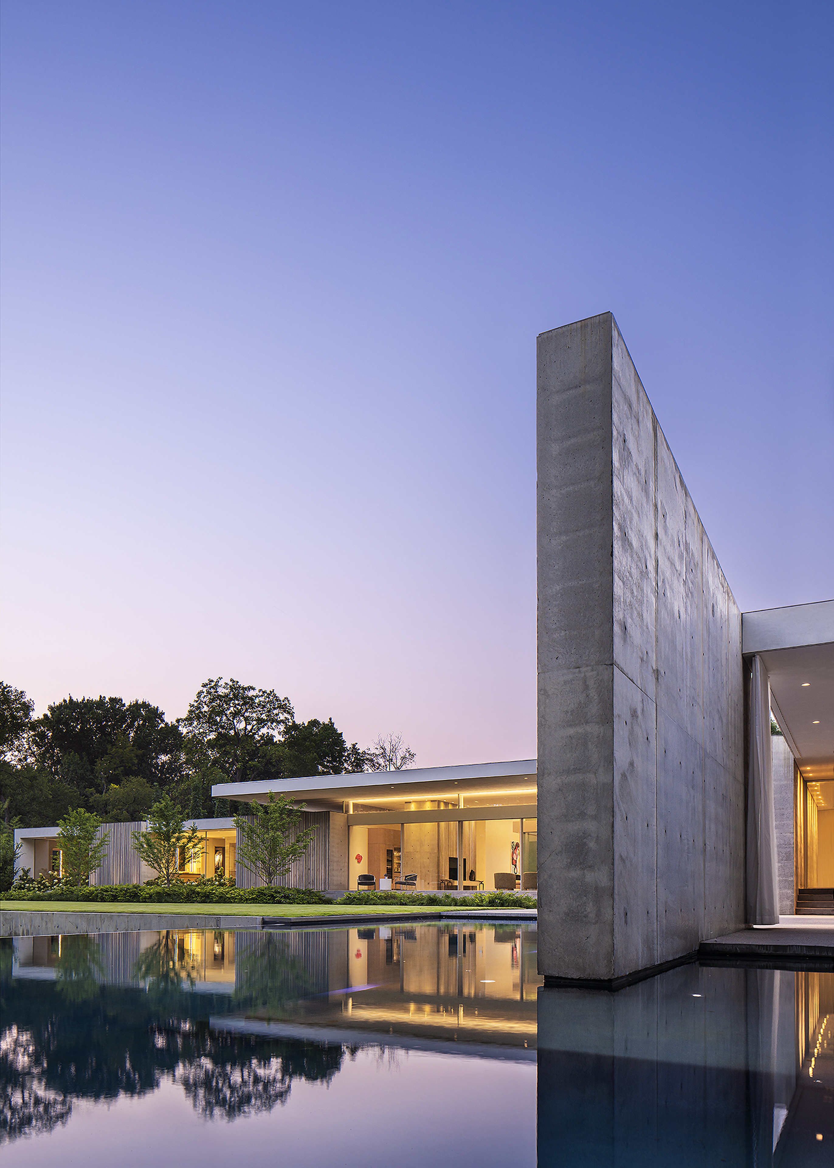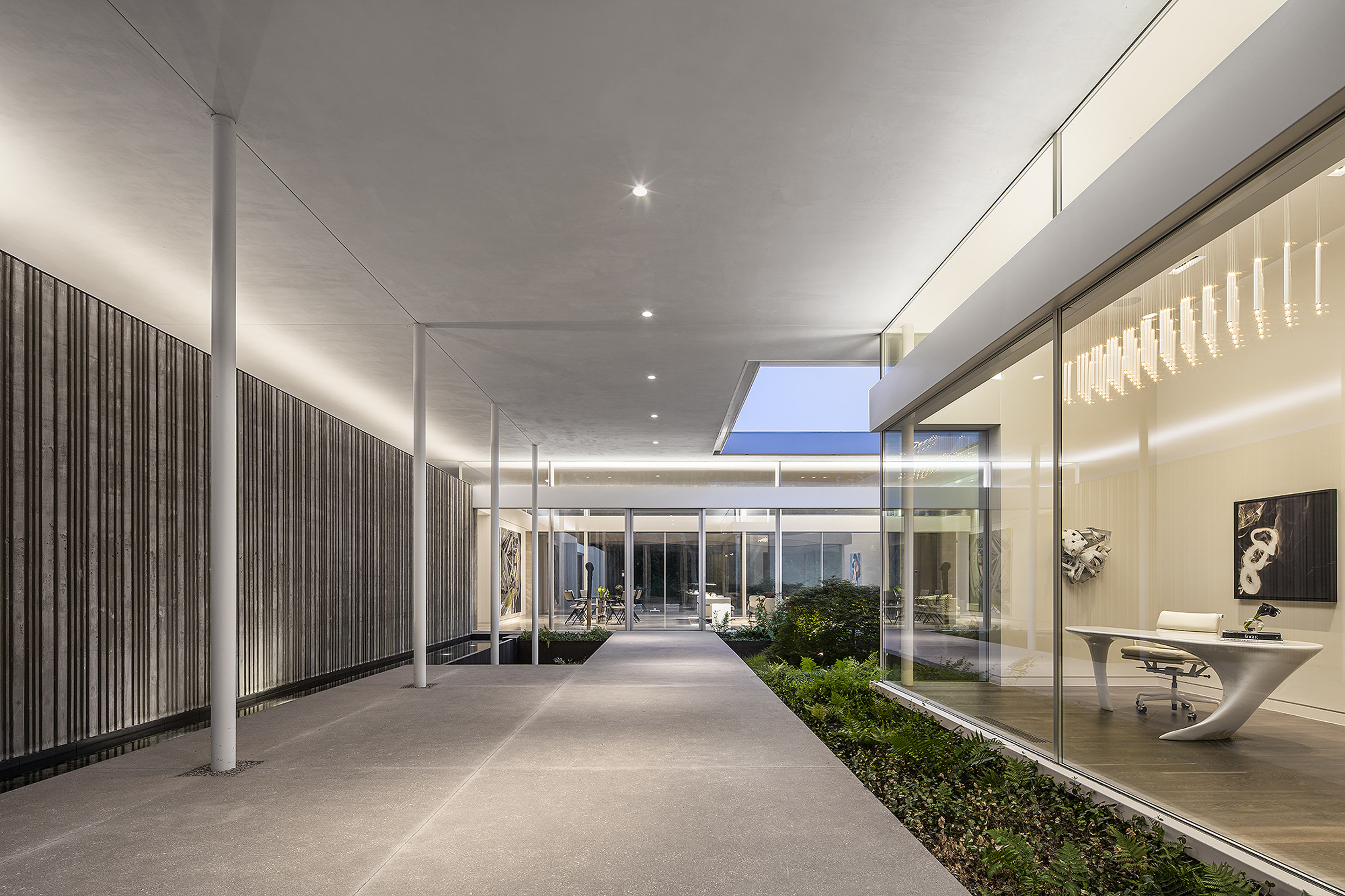 Interiors are carefully curated to provide their own strength within the rigorous architecture. Influences from the International Style, including Milo Baughman and Ib Kofod-Larsen, are anchored by a solid black granite Magni Home Collection table.