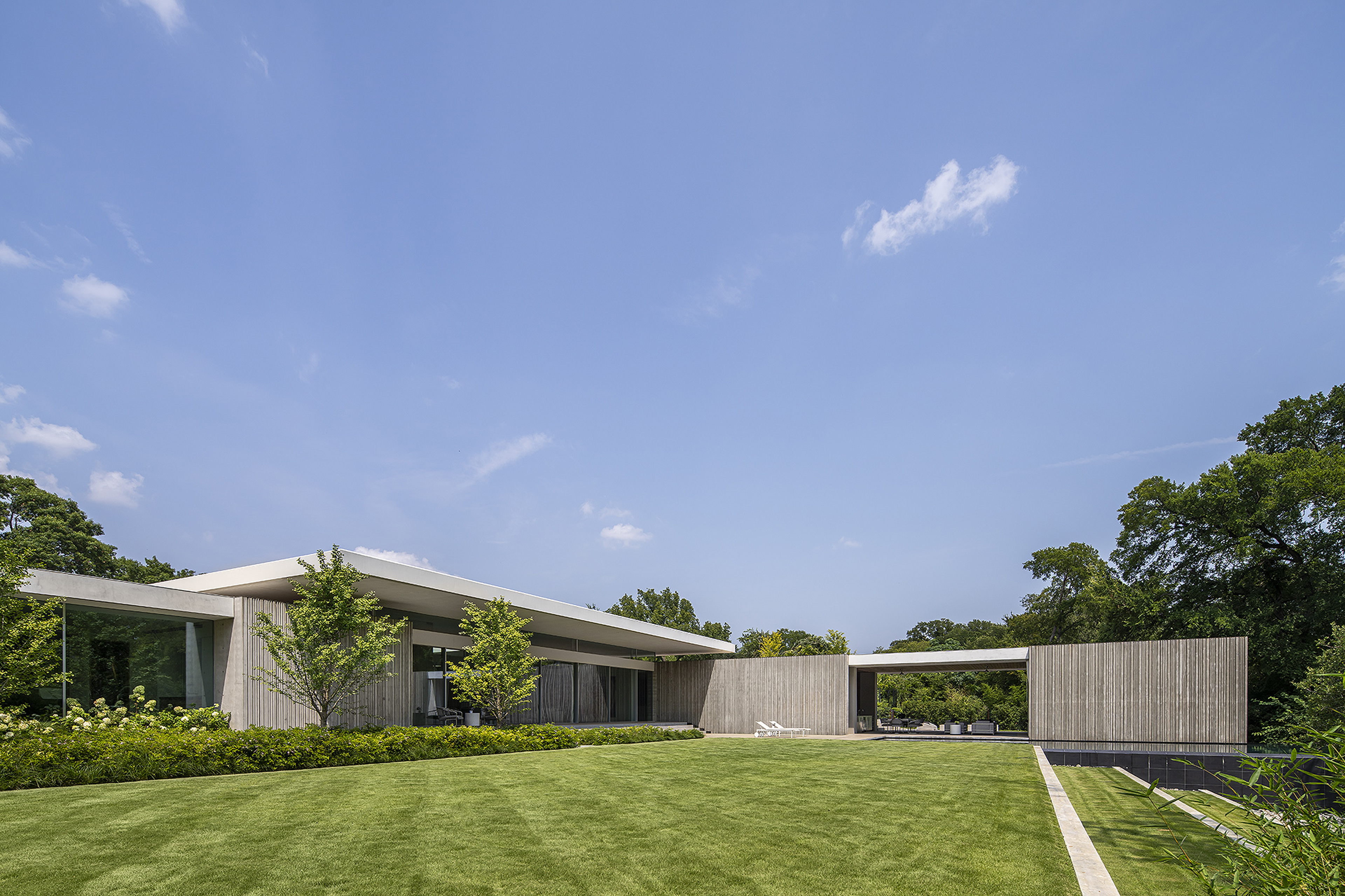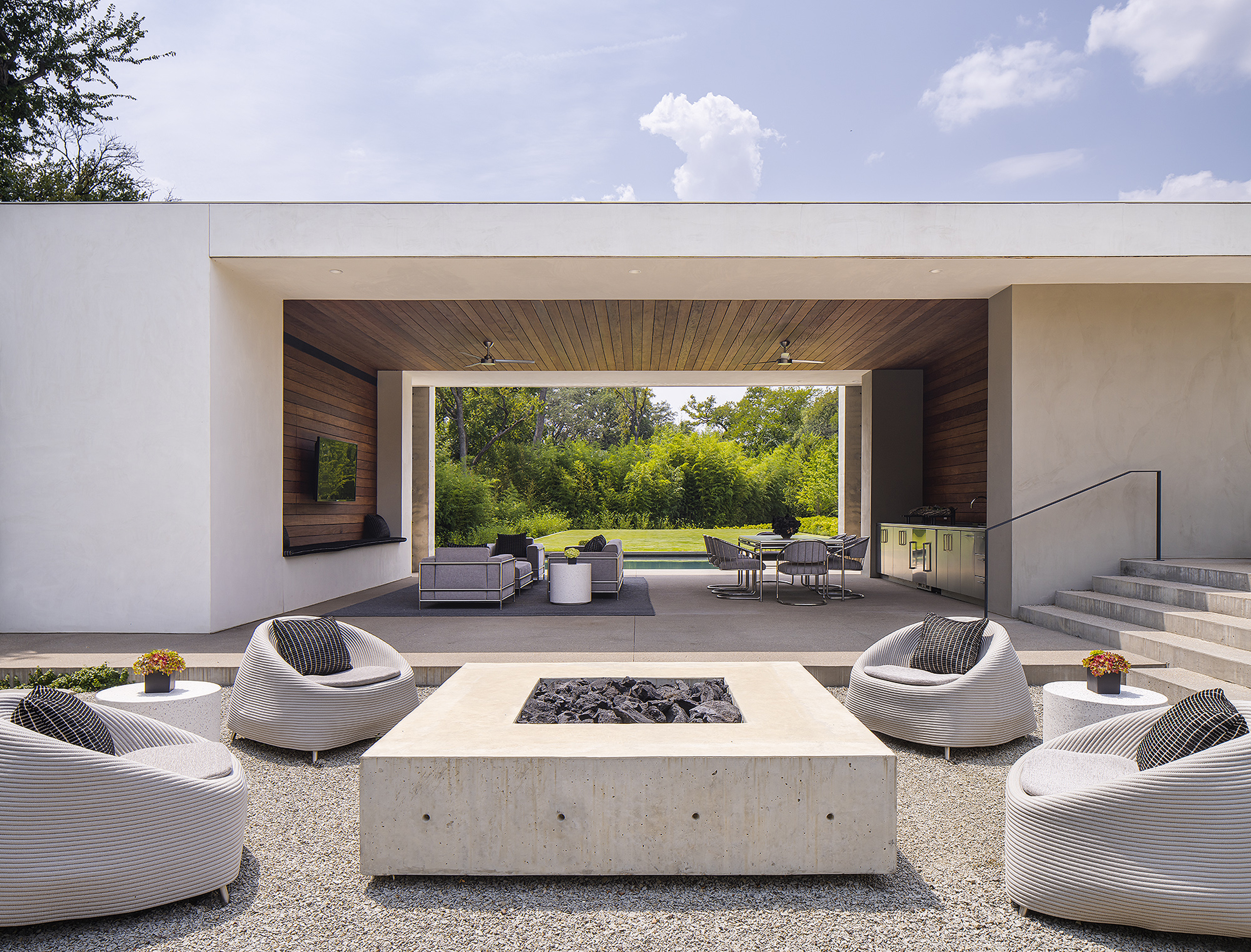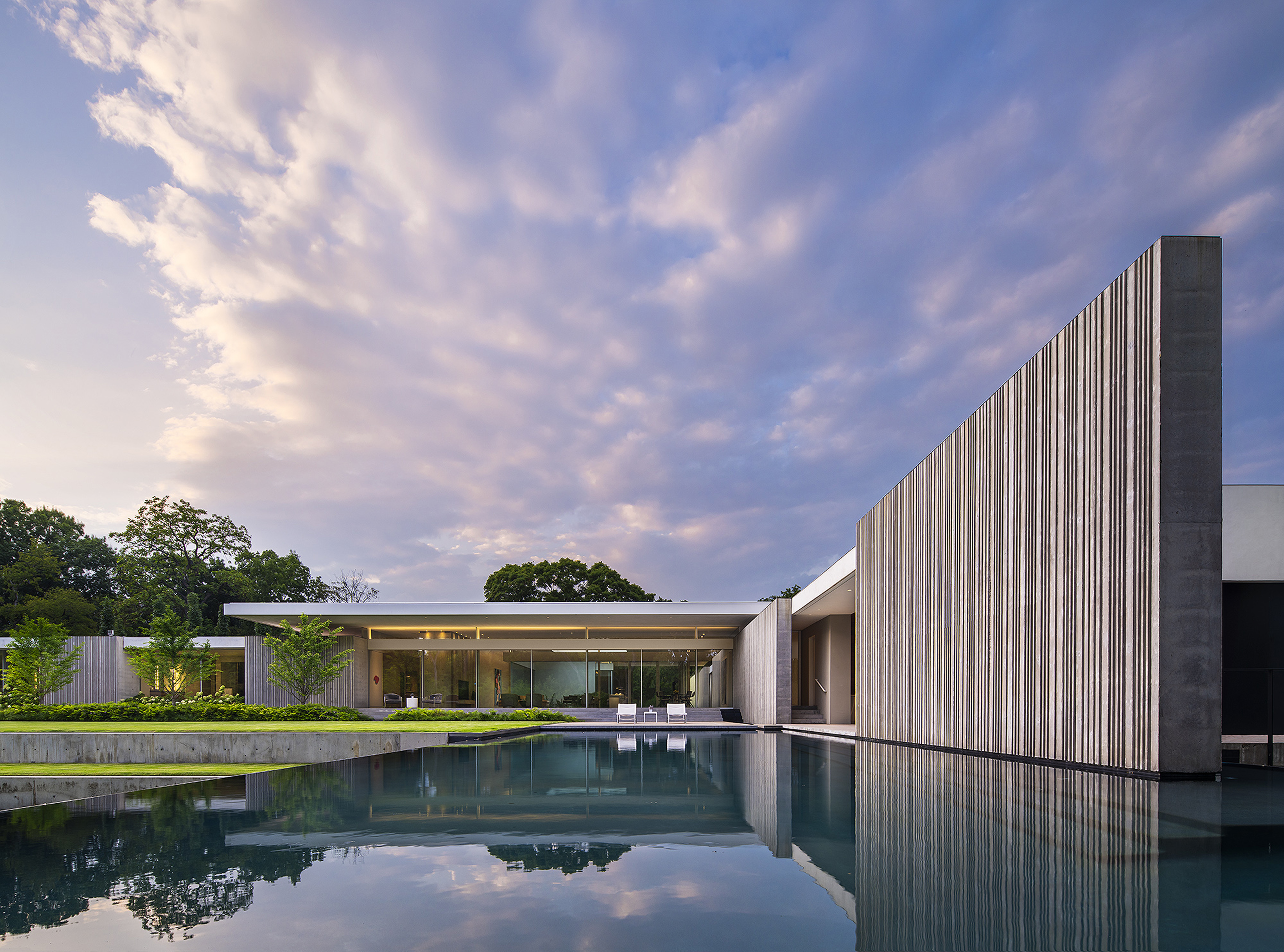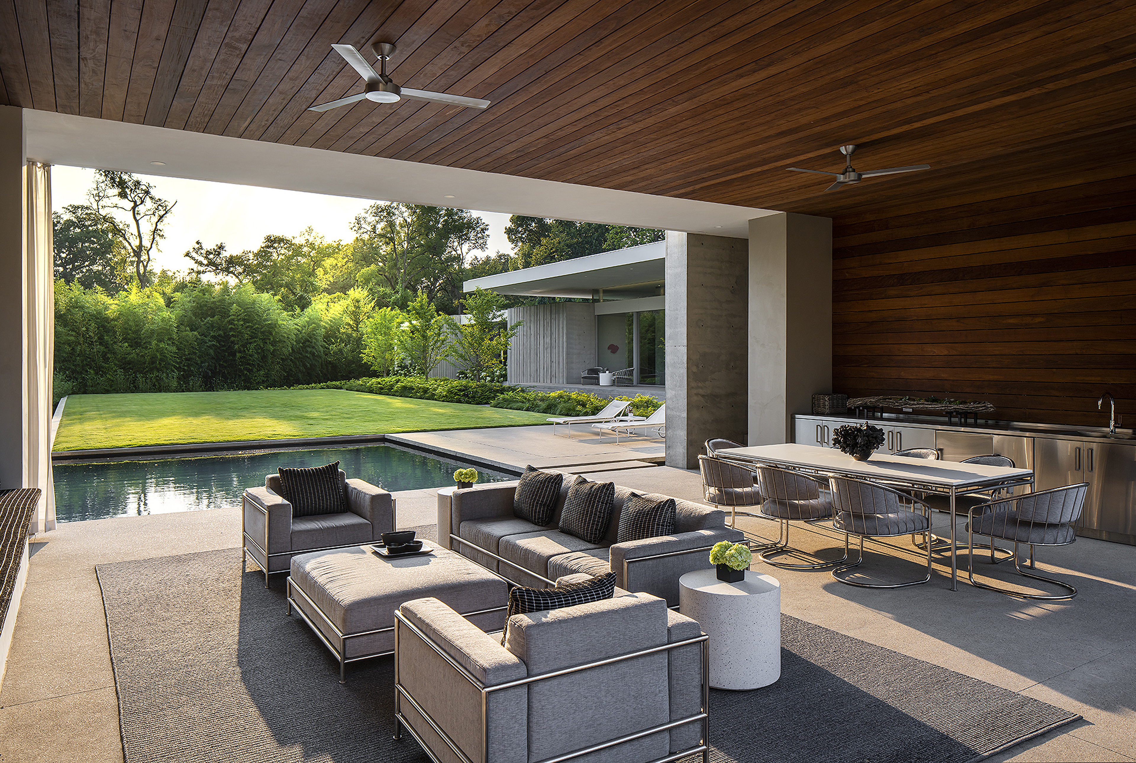 Interiors are carefully curated to provide their own strength within the rigorous architecture. Influences from the International Style, including Milo Baughman and Ib Kofod-Larsen, are anchored by a solid black granite Magni Home Collection table.