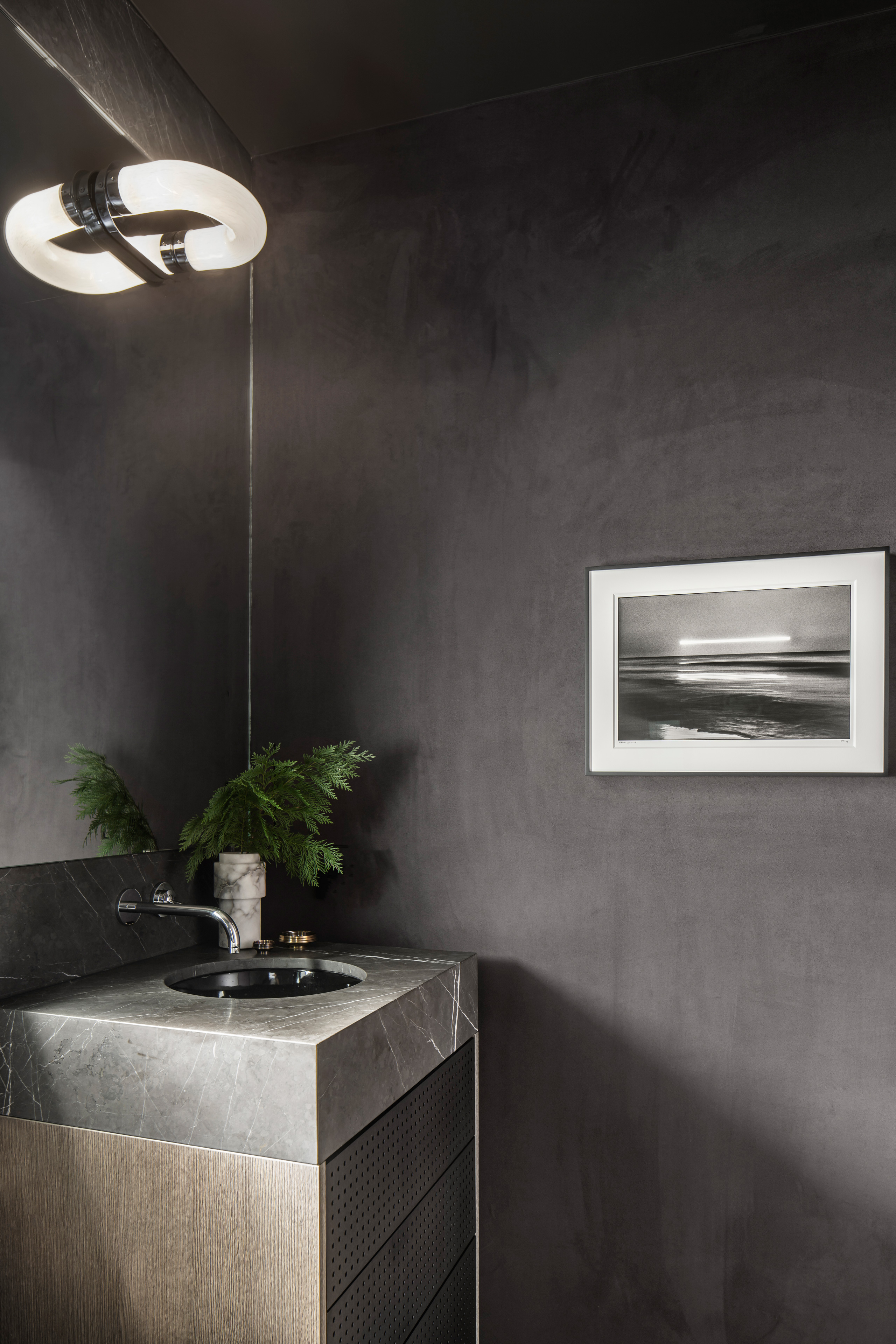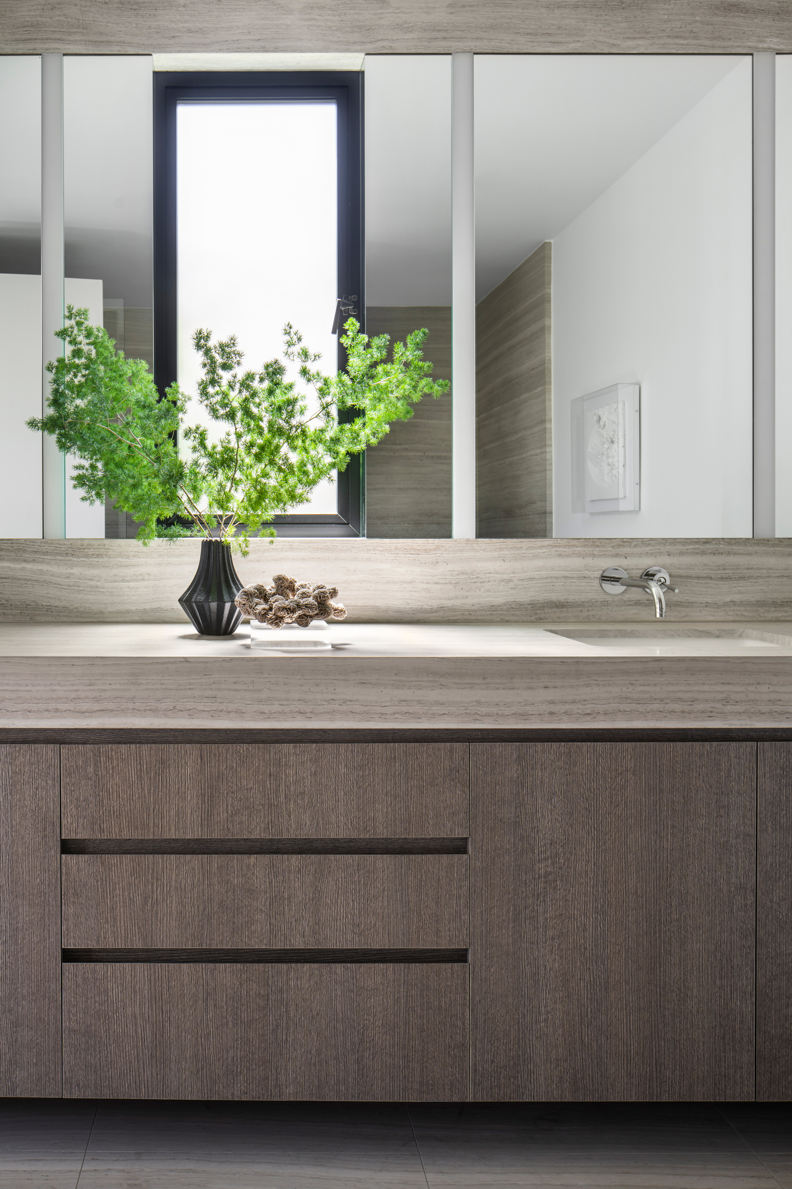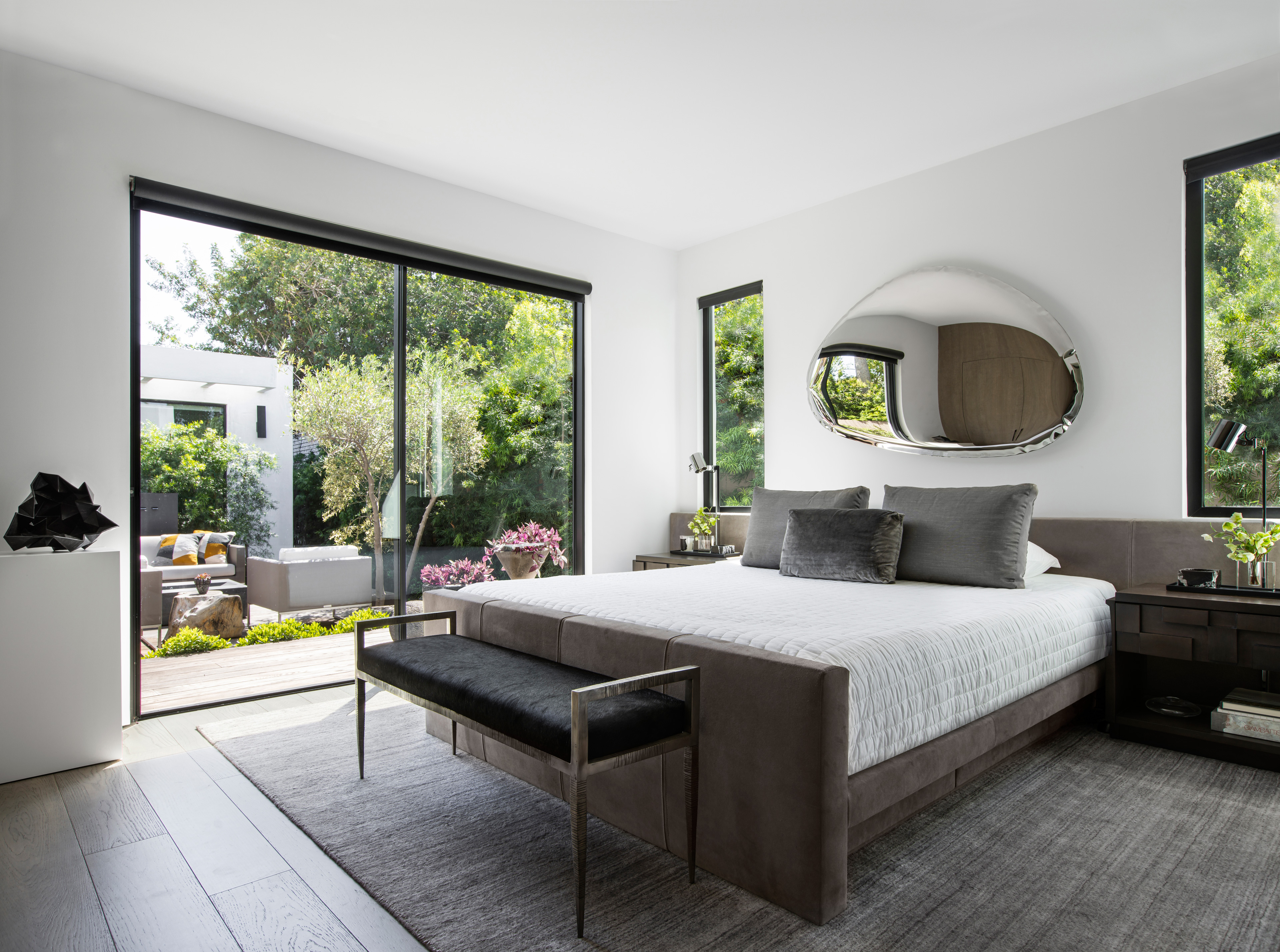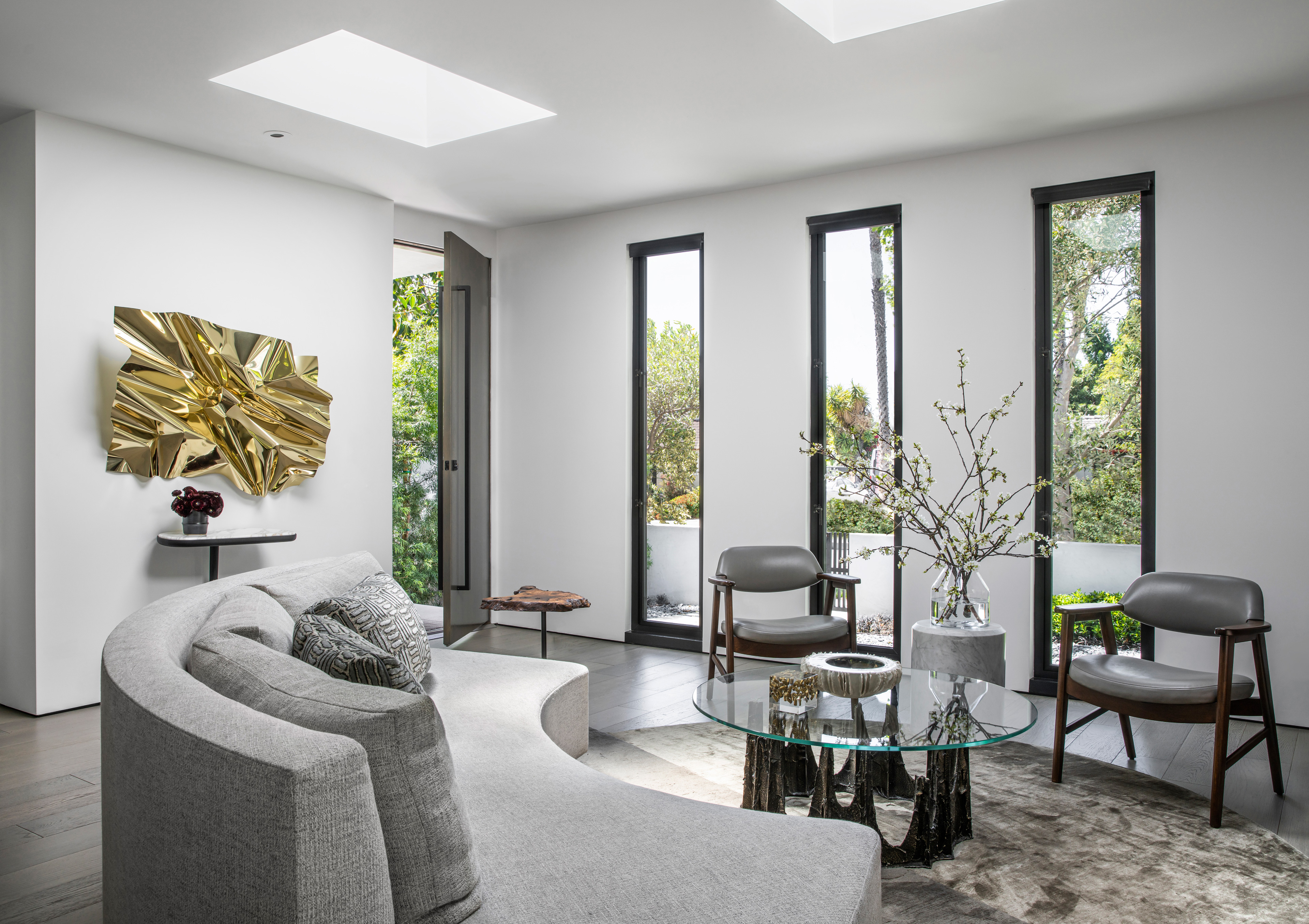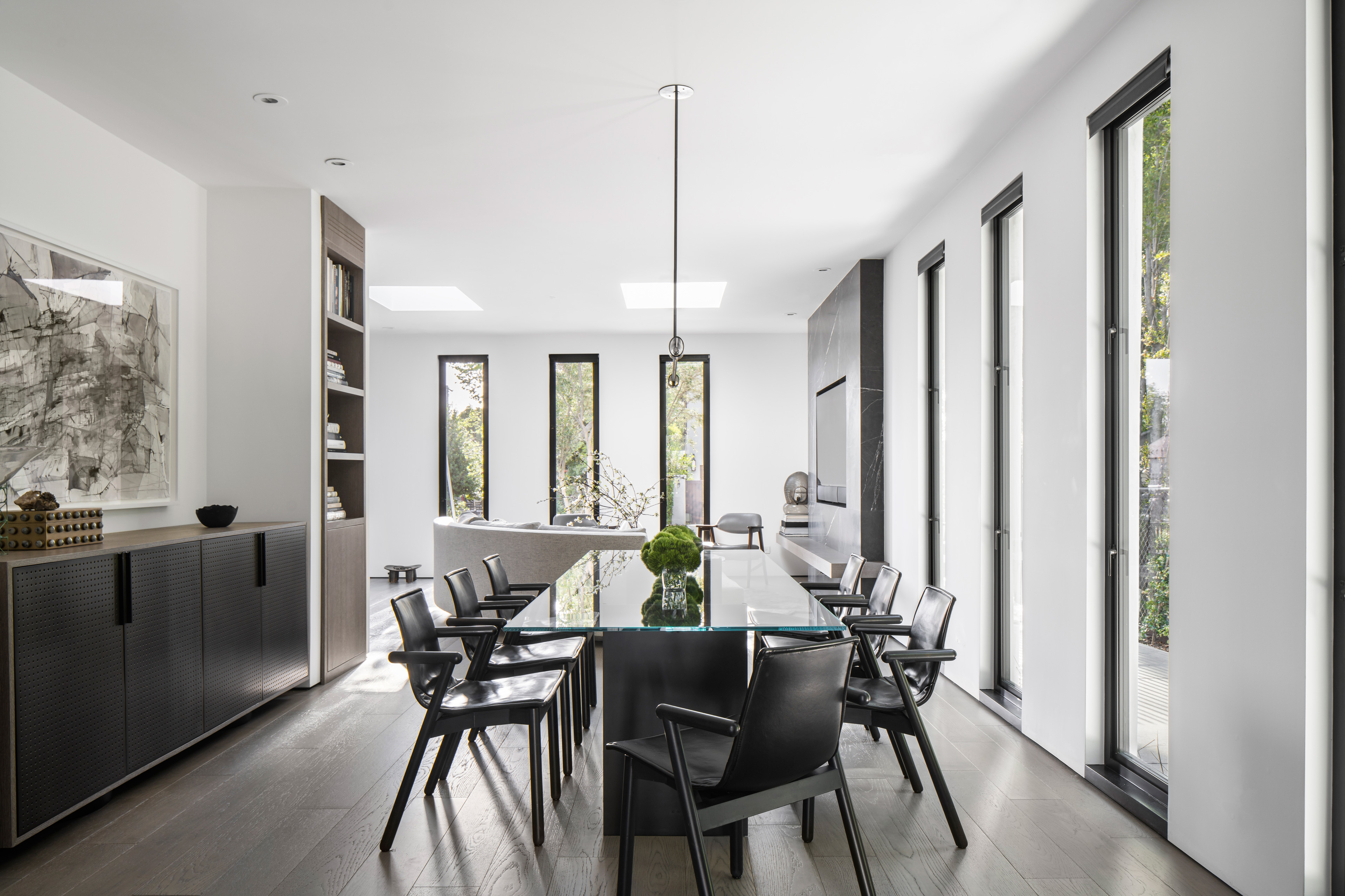Small spaces require studied proportions and scale to appear larger than reality. The Las Palmas Residence does just that with experiments in light, linearity and a consistency of palette. Repetitive linear glazings let the interior and exterior blend, and create a cinematic shadow play. Texture and contrast provide interest, in the Brutalist-inspired furnishings and the layered use of materials.